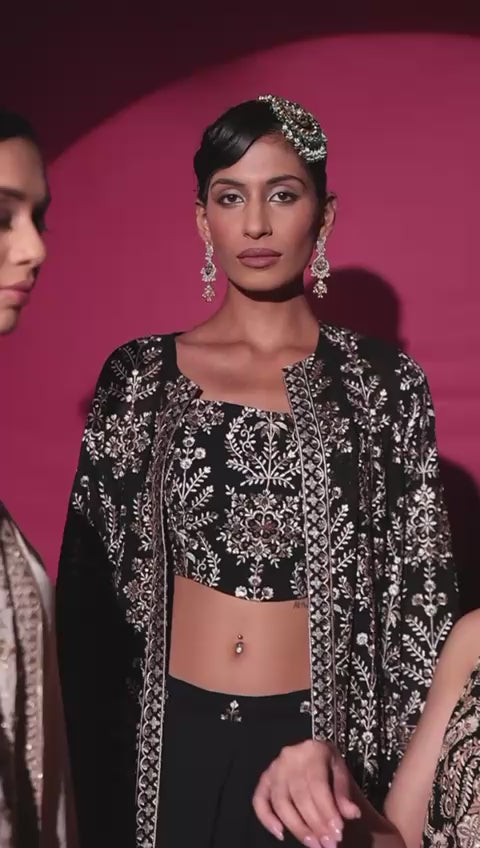 Celebrate your with zest and joy , by picking up our Avyah set as your outfit. The set comes with an off-shoulder cape with asymmetrical hemline and coordinated Mirror embroidered flared pants.